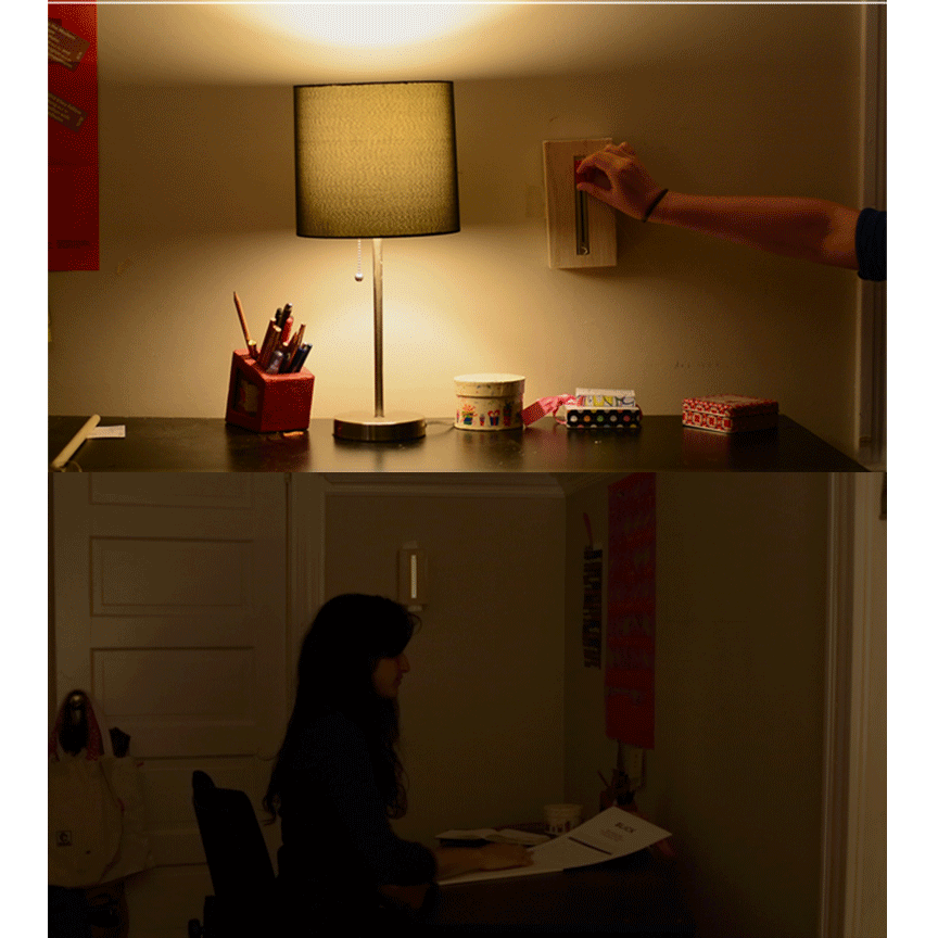 However, if the light in room B is turned on and the brightness is above half, the user in room A would feel strong haptic feedback on the switch. If the user continues pushing the switch, the other switch in room B would be pulled down by the system. In this scenario, LightShare acts like a smooth and tangible way of remote communication. Even though the user might not see the other users' activities, the haptic feedback indicates that the other party might need some light in there. For example, on a nice day when you are reading a book inside and your friend needs more light for intricate work, it might be kind to sit outside and yield the lighting to your friend.